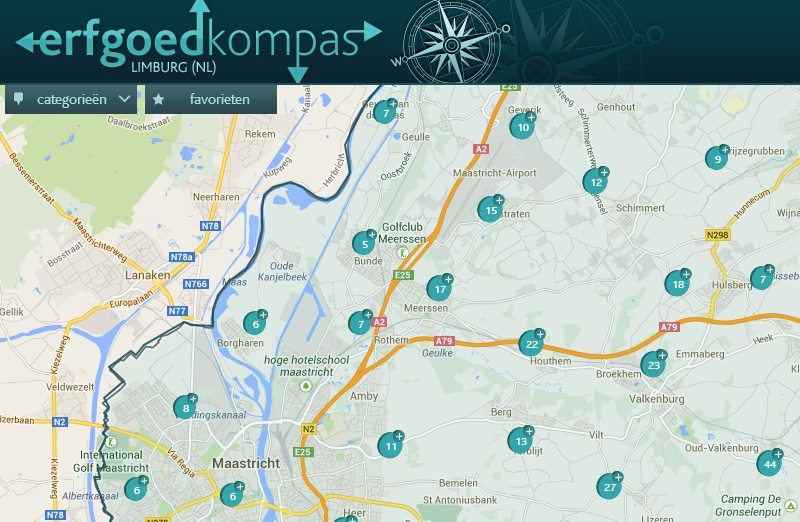 Erfgoedkompas wijst u de weg naar monumenten en erfgoed in verschillende regio’s in Vlaanderen en Zuid-Nederland. Op dit moment heeft alleen Zuid-Limburg ook een mobiele versie van de site.