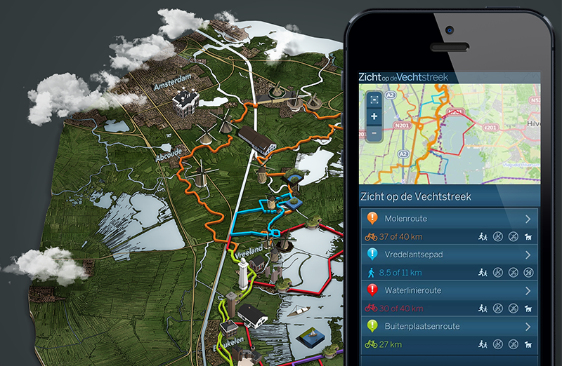 Thematische fiets-, vaar- en wandelroutes vertellen over buitenplaatsen, jaagpaden, molens en forten: de rijke historie van de Vechtstreek. Met de gratis app heb je alle routes en informatie bij je zonder internet!