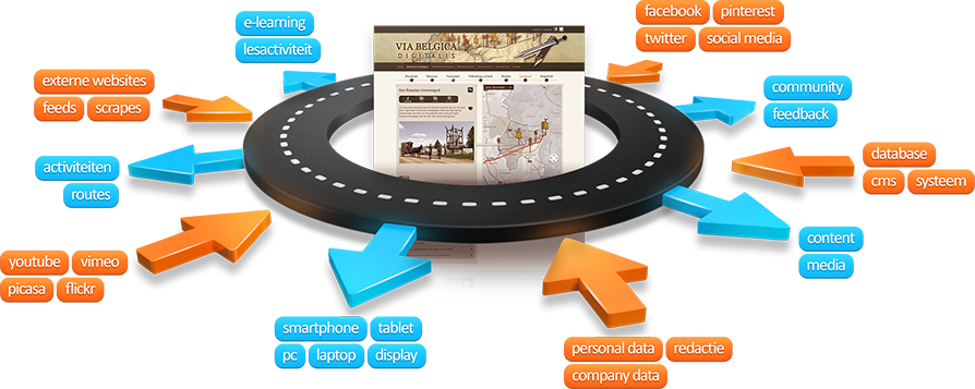 Bij KijkDaar kan de informatie uit verschillende bronnen ¹ samenkomen en via de site langs diverse kanalen ² weer gedistribueerd. En dat met zo weinig mogelijk extra redactionele inspanning.